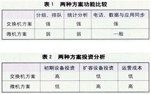 從表1和表2的比較可以看出,采用交換機方案有可能擁有更高的性能指標和最低綜合成本。但是,在建立電力呼叫中心時不能一概而論全部傾向于交換機方案,而應根據(jù)業(yè)務的規(guī)模和發(fā)展速度來分析。如大致估算5年內應設立的座席數(shù),若小于20個座席,則宜采用微機方案;若大于20個座席,則應采用交換機方案。