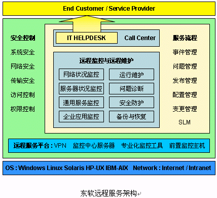 通過東軟遠程服務(wù)平臺向客戶提供基于廣域網(wǎng)的主機系統(tǒng)運行維護、數(shù)據(jù)庫系統(tǒng)運行維護、網(wǎng)絡(luò)系統(tǒng)運行維護、存儲備份系統(tǒng)運行維護、安全系統(tǒng)運行維護、系統(tǒng)升級和擴展服務(wù)等。