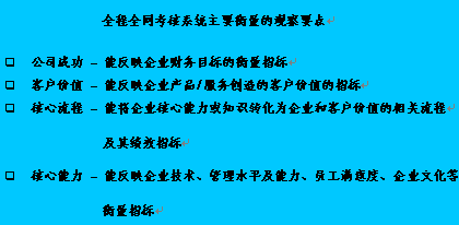 根據(jù)公司制定的策略目標(biāo),將平衡記分卡體系引入客戶服務(wù)的全程全網(wǎng)考核系統(tǒng)當(dāng)中,這一體系能比較全面和客觀地反映客戶關(guān)系中心的運(yùn)營(yíng)績(jī)效。完成整個(gè)全程全網(wǎng)考核系統(tǒng)設(shè)計(jì)的關(guān)鍵的成功因素為:
