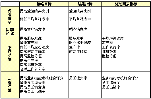 1)公司成功;2)客戶價(jià)值;3)核心流程;4)核心能力;成為呼叫中心全程全網(wǎng)考核衡量的四大維度,實(shí)際反映了呼叫中心運(yùn)營(yíng)管理中成本、客戶、內(nèi)部流程及呼叫中心的學(xué)習(xí)與成長(zhǎng)的四個(gè)至關(guān)重要的領(lǐng)域,是實(shí)現(xiàn)公司遠(yuǎn)景規(guī)劃與使命的營(yíng)運(yùn)管理核心。