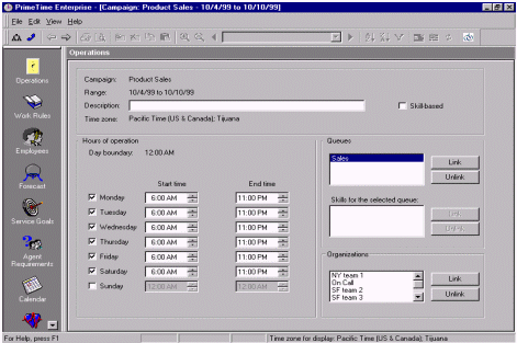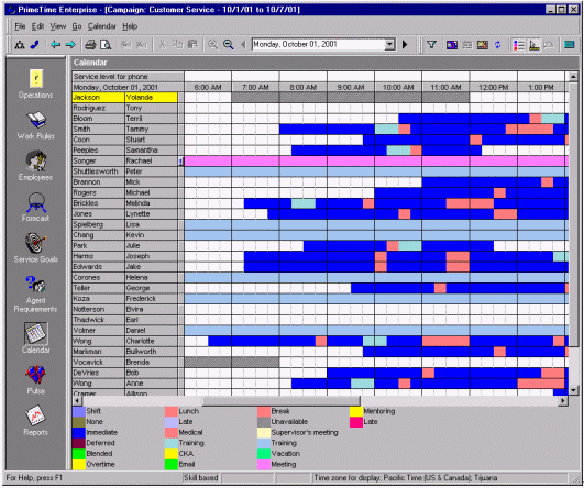 絕大多數(shù)的WFMS可以通過歷史數(shù)據(jù)和人員情況自動生成排班表。而且它也只是簡單的根據(jù)呼叫中心的運營時間來排班。舉個例子,某個呼叫中心在排班是有兩個班,一個工作時間是早7點到下午3點,另一個是早九點到晚五點,這就意味著不僅要安排早、晚休息,還要顧及到午休的時間。休息的安排要保證能夠在電話的持續(xù)中也能有持續(xù)的人員保證電話量。在這個自動化軟件的之中還有一個因素要能夠?qū)崿F(xiàn)自動化--人的因素。例如:Mary和Jane想同時去吃午餐,然而自動化的排班表并不是這樣的。然而主管根據(jù)當時的話務量情況和工作狀況以及工作規(guī)范批準了Mary和Jane共享午餐的要求,而WFMS就要能夠處理這樣很有可能發(fā)生,而且是合理的情況。排班表的更改應該就是簡單的拖拽圖標就應該能夠?qū)崿F(xiàn)的功能,并且能夠在這種更改會對預測的話務量差生不好影響時,拒絕這種拖拽行為。