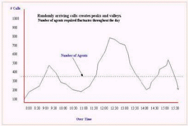 Inbound的來話量成不規(guī)則的波形圖,形成這種不規(guī)則波形圖中波峰和波谷的原因是在這些波峰和波谷工作的員工數(shù)量。(見圖8.來話量的分布圖)這將對在一天中的每個時段能夠分配最理想的員工來工作造成了最大的困難。一個小時能可能從來話量的波峰到達波谷,管理人員如何排班來匹配話務量對人員的要求,這是很多人的困惑。下圖描繪了某個呼叫中心8小時來話量分布情況。
