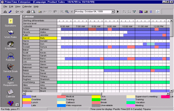 人員預測是一個每天、每周、每月、每年都需要作的工作計劃,為了能夠平衡呼叫中心人員的工作量和人員的可用性。通過將歷史數(shù)據(jù)和人員數(shù)據(jù)整合、加以分析,并借以WFMS體現(xiàn)出分配多少員工就可以達到既定的服務水準。一旦需要員工數(shù)量被估算出來,那么工作安排也就是每天、每周、每月、每天的排班表的輪廓也就出來了。絕大多數(shù)的WFMS軟件的界面和操作都很相似,最主要的就是內(nèi)容就是要包含員工的姓名、員工的工作時間、員工的其他日程(最小單位是15分鐘),并且能夠提供具有多個管理軟件接口,和多種不同的管理方式。圖9.就是一個典型的人員排班表,以15分鐘為單位體現(xiàn)人員的工作安排。附加選項還可以包含"休假""遲到""曠工"等等,并且這排班表還可以通過歷史數(shù)據(jù)體現(xiàn)出哪個時段可能出現(xiàn)人員不足哪個時段容易出現(xiàn)人員過,F(xiàn)象。