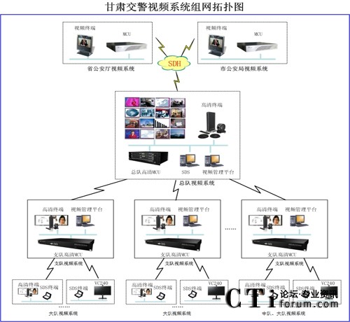本次建設(shè)的交警總隊(duì)視頻會議系統(tǒng),包含覆蓋全省交警總隊(duì)、多個支隊(duì)、大隊(duì)、中隊(duì)的大型視頻會議網(wǎng)絡(luò)。其中包含了2個總隊(duì)會場16個支隊(duì)、100個大隊(duì)與16個中隊(duì)。交警總隊(duì)、支隊(duì)、大(中)隊(duì)與省公安廳、市州公安局通過SDH專線進(jìn)行交互訪問,支隊(duì)與市州公安局、大隊(duì)與區(qū)縣公安局、總隊(duì)到各支隊(duì)的網(wǎng)絡(luò)均為專線聯(lián)接。