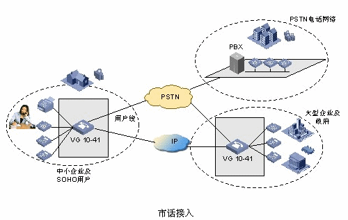 - 同時,VG 語音網(wǎng)關(guān)還提供FXO接口直接連接本地市話PSTN網(wǎng)絡(luò),從而實(shí)現(xiàn)SOHO用戶直接與市話連通,這種市話接入方式可以作為IP電話應(yīng)用的靈活備份,一方面節(jié)省了用戶投資,另一方面提供了意外情況(如停電)的處理方案。