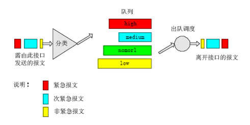 在報文到達路由設備接口后首先對報文進行分類,然后按照報文所屬的類別讓報文進入所屬隊列的尾部,在報文發(fā)送時按照優(yōu)先級總是在所有優(yōu)先級較高的隊列中的報文發(fā)送完畢后再發(fā)送低優(yōu)先級隊列中的報文,這樣在每次發(fā)送報文時總是將優(yōu)先級高的報文先發(fā)出去,保證了屬于較高優(yōu)先級隊列的報文有較低的時延與丟失率。