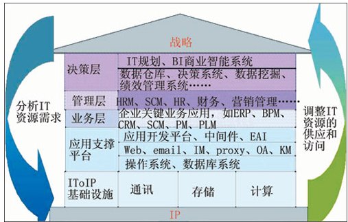 按照華為3Com的構(gòu)想,如果把整個IT系統(tǒng)比做一座房屋,那么整個房屋的地基就是IP網(wǎng)絡(luò),需要基于IP網(wǎng)絡(luò)來構(gòu)建通信、存儲、計算等IT基礎(chǔ)設(shè)施。在這些基礎(chǔ)設(shè)施之上,則是應(yīng)用支撐平臺(操作系統(tǒng)、數(shù)據(jù)庫系統(tǒng)、應(yīng)用開發(fā)平臺等),基于應(yīng)用支撐平臺提供給機構(gòu)的關(guān)鍵業(yè)務(wù)流程信息系統(tǒng)(如ERP、SCM等),最終為用戶的管理和決策提供支持!霸趹(zhàn)略與IT基礎(chǔ)設(shè)施之間實現(xiàn)實時同步互動,IT為用戶高層提供商業(yè)智能系統(tǒng)、決策系統(tǒng),以便決策層即時掌握信息,作為機構(gòu)戰(zhàn)略決策、戰(zhàn)略挑戰(zhàn)的依據(jù);用戶可以依據(jù)內(nèi)、外部變化,進行戰(zhàn)略調(diào)整時快速分析新的IT資源需求,同步調(diào)整IT資源的配置,從而使IT與業(yè)務(wù)戰(zhàn)略保持同步!边@正是IToIP的基本理念。
