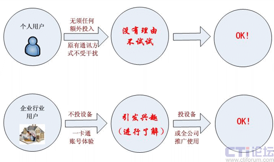 通過(guò)一卡通的方式,客戶可以利用原來(lái)的座機(jī)、小靈通、手機(jī),直接接入VOIP的通訊平臺(tái),享受運(yùn)營(yíng)商、虛擬運(yùn)營(yíng)商提供的各種服務(wù)項(xiàng)目。由此,大大降低了客戶享受服務(wù)的門檻,極大地?cái)U(kuò)展了潛在客戶群。