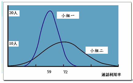但故事到這里就結(jié)束了嗎?當(dāng)然還沒有。我們?cè)賮砜葱〗M二有多少人的通話利用率剛好是72,從圖中輕易看出是10人,平均數(shù)的高峰人數(shù)低于小組一,這不是重要的信息,更重要的是小組二的座席員的表現(xiàn)差異很大,分布很廣,雖然平均數(shù)高于小組一,但有些組員的表現(xiàn)盡然比小組一表現(xiàn)最差的還要來的差。