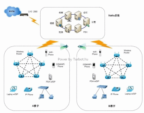 如果當(dāng)整個樓宇被WiFi網(wǎng)絡(luò)覆蓋,用戶可通過WiFi Phone或支持WiFi功能的PDA手機(jī)注冊到Netta交換系統(tǒng),如使用有線網(wǎng)絡(luò),用戶可通過Gateway