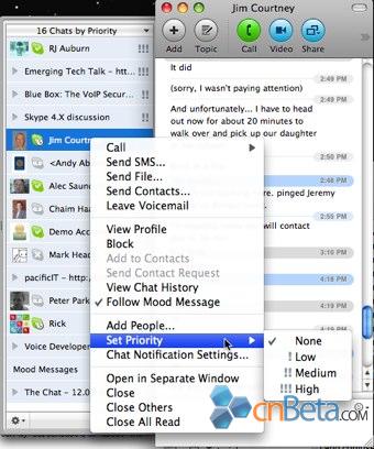 Skype 2.8 for Mac將于明天正式發(fā)布,它將帶來(lái)全新的功能,包括"屏幕共享"(screen sharing)和整合Wi-Fi熱點(diǎn)連接功能。此次新版本將首先向Mac OS X發(fā)布,不知道是不是為了迎接Macworld的到來(lái)。此次版本主要更新以下幾點(diǎn):