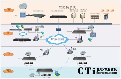 IP電話系統(tǒng)項目方案設計共分省、地州市、縣(市)三級進行部署,按照省集團至地州市分集團、縣(市)級分集團及營業(yè)廳建設,全網(wǎng)通過部署相應的IP電話設備(含語音軟交換、接入網(wǎng)關(guān)、PC軟電話、網(wǎng)管軟件、計費軟件等),組建全省IP電話系統(tǒng)。