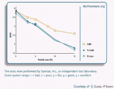 無(wú)論在高丟包率條件下還是在沒(méi)有丟包的條件下,iLBC的語(yǔ)音質(zhì)量都優(yōu)于目前流行的G.723.1, G.729A等標(biāo)準(zhǔn)編解碼;而且丟包率越大,使用iLBC的語(yǔ)音質(zhì)量?jī)?yōu)勢(shì)越明顯。通常情況下,為了衡量IP網(wǎng)絡(luò)語(yǔ)音質(zhì)量,將≥5%丟包率的網(wǎng)絡(luò)情況定義為VoIP的極限網(wǎng)絡(luò)條件。經(jīng)過(guò)語(yǔ)音質(zhì)量測(cè)試,即使在5%丟包率的情況下,iLBC仍然能夠提供相當(dāng)于GSM手機(jī)的語(yǔ)音質(zhì)量。