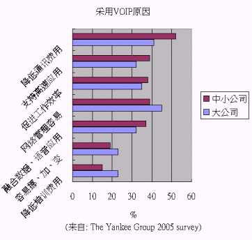 根據(jù)美國著名的咨詢公司 The Yankee Group 2005 年的調(diào)研各企業(yè)使用VOIP的原因,大企業(yè)與中小企業(yè)略有差異:大企業(yè)認(rèn)為網(wǎng)絡(luò)管理、省錢、促進(jìn)工作效率為最關(guān)鍵的三個(gè)原因;中小企業(yè)則認(rèn)為省錢、網(wǎng)絡(luò)管理容易、支持高速應(yīng)用、促進(jìn)工作效率為主要原因。