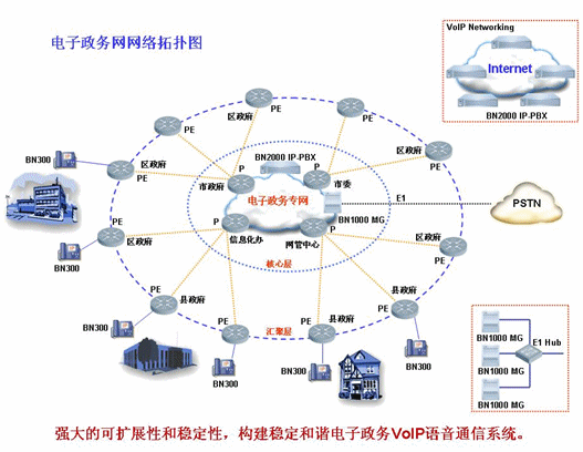 MG和BN2000 IP PBX就可以利用電子政務(wù)網(wǎng)自身的優(yōu)勢(shì),實(shí)現(xiàn)VoIP語音通信。電子政務(wù)網(wǎng)內(nèi)的所有IP電話用戶統(tǒng)一在核心層的BN2000
