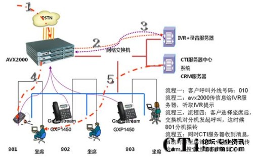 在方案中外線呼入IPPBX,IPPBX根據(jù)呼入路由指向特定rtsp號碼,rtsp根據(jù)配置引導IVR服務器開始播放語音,客戶根據(jù)語音提示按鍵轉(zhuǎn)接坐席、傳真或自動語音應答等;坐席接聽時同時屏幕彈出CRM中關(guān)于該來電號碼的相關(guān)信息,使坐席能做針對性的應答和服務,同時記錄報表數(shù)據(jù)供查詢。