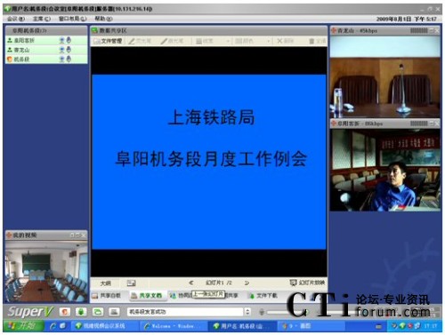 CTI論壇(ctiforum)08月06日消息: 日前,京九干線主力機務(wù)段——上海鐵路局阜陽機務(wù)段成功啟動視維Super-V視頻會議系統(tǒng)。阜陽機務(wù)段的領(lǐng)導(dǎo)和職工,每天早上8點上班后,第一件事情就是登陸視頻會議系統(tǒng),匯報前日工作情況、部署當(dāng)日工作內(nèi)容。已然,山大聯(lián)潤為上海路局阜陽機務(wù)段部署的阜陽機務(wù)段視頻會議系統(tǒng),成為鐵路部門必不可少的遠程溝通交流工具,在有效提高鐵路系統(tǒng)溝通效率的同時,保障了鐵路運輸?shù)陌踩,極大滿足了鐵路部門暑期運營業(yè)務(wù)對溝通和會議的需求。
