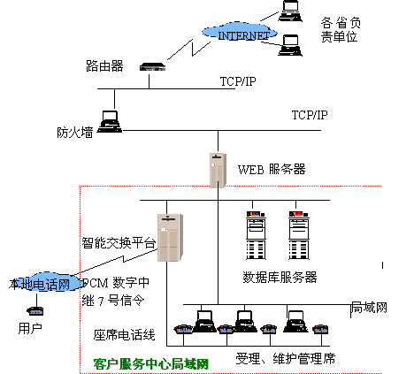 數(shù)據(jù)通信局的客戶遍布全國各地,建立一個(gè)覆蓋全國的客戶服務(wù)網(wǎng)絡(luò)勢在必行,因此我公司為之構(gòu)建了數(shù)據(jù)通信局客戶服務(wù)系統(tǒng),全國各地的各個(gè)客服中心的數(shù)據(jù)可以通過專線連接,語音也可以通過VOIP用數(shù)字專線連接,以降低長話費(fèi)用。該系統(tǒng)的投入使用,不但滿足了數(shù)據(jù)局為全國各地客戶服務(wù)的需要,而且可以收集客戶信息,不但降低了辦公費(fèi)用,而且有利于擴(kuò)大市場分額。數(shù)據(jù)通信客戶服務(wù)中心的主要目的是解決對全國大客戶的業(yè)務(wù)咨詢與申辦、障礙申告、投訴與建議的集中管理以及處理控制,系統(tǒng)采用800號(hào)接入,以一個(gè)小型的交換設(shè)備為座席電話分配點(diǎn),客戶撥入的電話,經(jīng)小型交換設(shè)備分配到空閑的座席上。