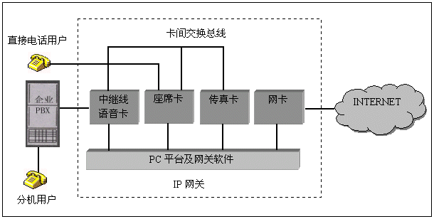 電話語音卡在IP網(wǎng)關中的典型應用結構如下: