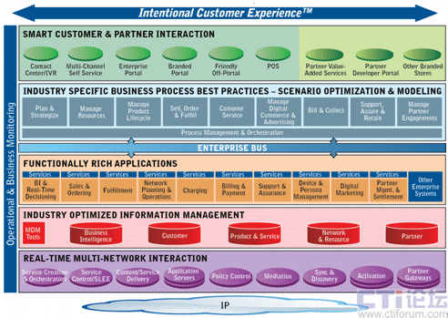 其次,CES改變了現(xiàn)有的業(yè)務(wù)應(yīng)用層將功能和流程融合在一起的模式,對流程和功能進行了分離。實際上,應(yīng)用功能和流程結(jié)合得越緊密,系統(tǒng)的適應(yīng)性就會越差,對新業(yè)務(wù)和新產(chǎn)品的響應(yīng)時間就越長,CES將業(yè)務(wù)應(yīng)用層分為流程層和應(yīng)用功能層,流程和功能的分離極大的提高了系統(tǒng)靈活性,降低了系統(tǒng)集成的復(fù)雜程度和成本開銷,滿足了新業(yè)務(wù)和新產(chǎn)品快速上市的要求。在流程層,運營商不僅可以選擇采用Amdocs在25年服務(wù)經(jīng)驗的基礎(chǔ)上總結(jié)的業(yè)界最佳實踐的業(yè)務(wù)流程,也可以選擇采用企業(yè)現(xiàn)有的業(yè)務(wù)流程;在應(yīng)用功能層,Amdocs全系列軟件產(chǎn)品將更加模塊化,運營商可以選擇Amdocs全系列軟件產(chǎn)品,也可以選擇其中的個別或部分產(chǎn)品,這種高度模塊化的產(chǎn)品將以更快的速度集成到運營商已有的IT框架中。