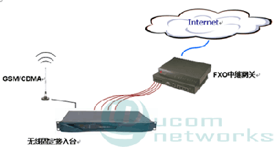 本方案采用FXO中繼語音網(wǎng)關(guān)接入互聯(lián)網(wǎng),由當(dāng)?shù)仄胀M電話線路落地對(duì)接網(wǎng)關(guān)FXO口,采用電話卡綁定網(wǎng)關(guān)預(yù)付費(fèi)計(jì)費(fèi)實(shí)現(xiàn)運(yùn)營。落地線路接入可以使用本地固定PSTN線路,也可以轉(zhuǎn)制無線電話,采用固定臺(tái)接入,2種拓?fù)鋱D如下所示。