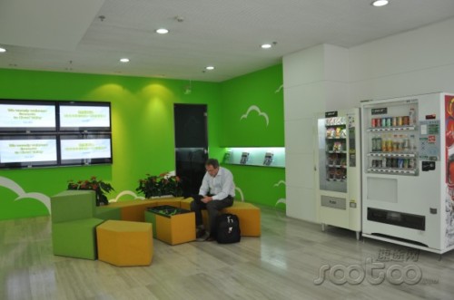 以鮮亮的黃色和綠色為主色調(diào)的天潤融通云基地總部休息區(qū)