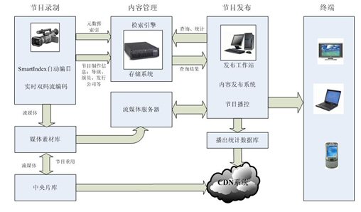 節(jié)目制作平臺(tái)主要負(fù)責(zé)節(jié)目的采編,接收節(jié)目源的數(shù)字視頻信號(hào)和模擬視頻信號(hào)進(jìn)行實(shí)時(shí)/超實(shí)時(shí)的轉(zhuǎn)碼,并同時(shí)進(jìn)行自動(dòng)編目、歸檔,滿(mǎn)足系統(tǒng)不同應(yīng)用的要求。另外,各資源建設(shè)成員單位或各地、州、市遠(yuǎn)程辦按照省遠(yuǎn)程辦的統(tǒng)一部署,加工各自類(lèi)別的課件,采用人工傳送介質(zhì)或利用VPN實(shí)現(xiàn)專(zhuān)網(wǎng)的方式送交到資源庫(kù)系統(tǒng)中,實(shí)施統(tǒng)一的存儲(chǔ)和管理。