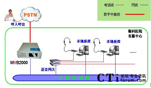 醫(yī)院采用暢信達(dá)通信MVB2000系統(tǒng)作為交換平臺(tái),采用1路E1數(shù)字中繼線接入,對外公布統(tǒng)一的外線呼入號碼,采用語音網(wǎng)關(guān)結(jié)合話機(jī)作為座席終端,前期投入8位人工座席,系統(tǒng)架構(gòu)形式如下: