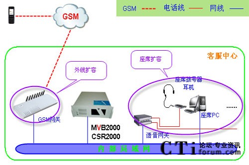 呼叫中心用于30路GSM網絡接入、20個座席人員使用,要求以后可擴展到50座席人員或者更多。