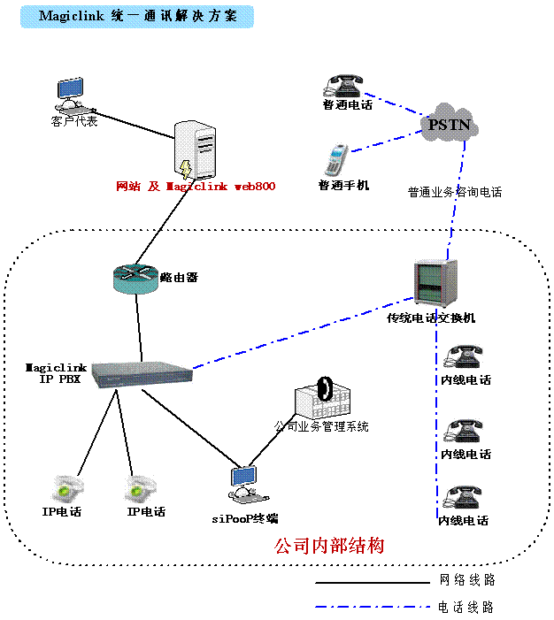 Magiclink統(tǒng)一通訊解決方案利用我公司的全線產品,將企業(yè)的:網站、內部電話、呼叫中心、客戶管理系統(tǒng)完整的整合在一起。通過這種整合起到了:降低成本、增加營銷手段、提升資源利用率的特點。