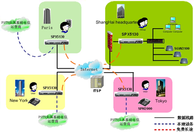 隨著公司在全世界開(kāi)設(shè)眾多的部門,IP電話技術(shù)將會(huì)是不同分公司之間實(shí)現(xiàn)低費(fèi)用高品質(zhì)語(yǔ)音通訊的方式。SINOCO公司的IP-PBX 系統(tǒng)解決方案,利用 SPX-5130設(shè)備通過(guò)互連網(wǎng)連接到公司的各個(gè)分支機(jī)構(gòu),提供分級(jí)體系結(jié)構(gòu),更進(jìn)一步提供了可靠的,靈活的語(yǔ)音通訊解決方案,從而滿足公司快速回應(yīng)客戶的需求。同時(shí),它也降低了總部和分部之間的電話費(fèi)用。總部和分部間昂貴的國(guó)際電話費(fèi)用將不再存在, 而且享受高品質(zhì)的語(yǔ)音通訊質(zhì)量。