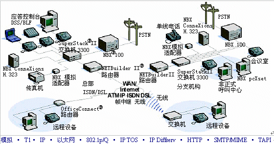 使用標(biāo)準(zhǔn)多協(xié)議路由器,諸如3Com PathBuilder或NET Builder II路由器,您能夠通過廣域網(wǎng)或Internet將多個分支機(jī)構(gòu)與您的總部系統(tǒng)相連接。您可以隨意選擇網(wǎng)絡(luò): 支持工業(yè)標(biāo)準(zhǔn)Internet協(xié)議(IP)聯(lián)網(wǎng)的DSL、電纜、幀中繼或ISDN。您甚至能夠通過使用3Com NBX ConneXtions H.323網(wǎng)關(guān)應(yīng)用,來充分利用低成本、高質(zhì)量的IP語音 (VoIP) H.323服務(wù)。因?yàn)镹BX ConneXtion使用Internet作為長途線路上本地到本地的撥號路徑,因此它能夠以極低的成本提供傳統(tǒng)電話專用線路和后端分機(jī)(OPX)線路的優(yōu)勢。