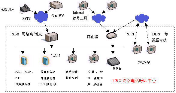 外部訪問統(tǒng)一路由分配:NBX網(wǎng)絡(luò)呼叫中心各種外部訪問:電話、傳真、WEB、郵件進(jìn)行統(tǒng)一分配。