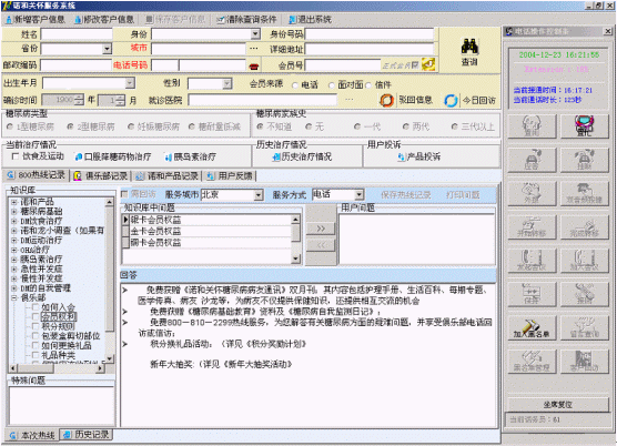 諾和關(guān)懷糖尿病服務(wù)中心的服務(wù)坐席可以實現(xiàn)患者信息的同步提示功能,當(dāng)電話被分配至坐席的同時,患者的資料信息也同步出現(xiàn)在PC終端上。同時坐席終端可以自動記錄對方的電話號碼,也可以實時顯示正在排隊等待的人數(shù),提示服務(wù)人員加快業(yè)務(wù)受理速度。