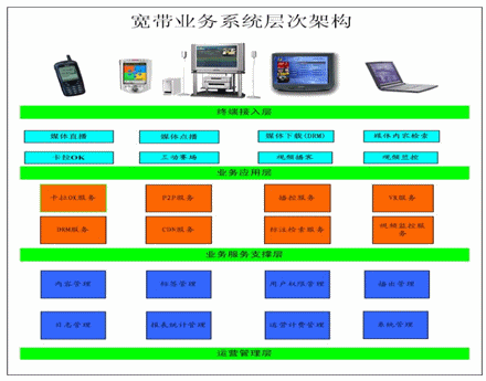 提供多種寬帶業(yè)務(wù)產(chǎn)品包,如網(wǎng)絡(luò)卡拉OK業(yè)務(wù),持網(wǎng)絡(luò)視頻播客業(yè)務(wù),網(wǎng)絡(luò)視寬頻視野業(yè)務(wù),也可根據(jù)用戶需求定制拓展業(yè)務(wù)如遠(yuǎn)程教學(xué)業(yè)務(wù),網(wǎng)絡(luò)音像發(fā)行出版業(yè)務(wù)(數(shù)字版權(quán)保護(hù)),網(wǎng)絡(luò)電視臺(tái)業(yè)務(wù),多媒體辦公業(yè)務(wù)等。