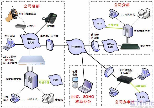 采用SE30系列的IP語音媒體交換機(jī)搭建辦公語音通信平臺(tái),簡化了原先繁雜的語音通信系統(tǒng),可以輕而易舉地集成到用戶現(xiàn)有的網(wǎng)絡(luò)中,節(jié)省了大量的網(wǎng)絡(luò)改造成本及通訊費(fèi)用。部署快捷、管理方便、功能強(qiáng)大、應(yīng)用靈活、降低成本等優(yōu)勢明顯;特別適用于出差、家庭辦公、移動(dòng)辦公頻繁的現(xiàn)代中小型企業(yè)用戶,極容易實(shí)現(xiàn)多點(diǎn)異地VoIP組網(wǎng)應(yīng)用。