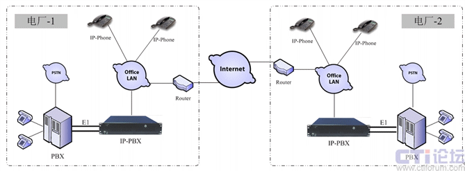 對于傳統(tǒng)的PBX改造,可以通過IP PBX的E1端口進(jìn)行連接,通過PRI或R2信令進(jìn)行通信,這樣傳統(tǒng)PBX下的分機(jī)就可以通過撥打連接IP PBX的中繼出局號來撥入VOIP系統(tǒng),例如撥“0”到PSTN,撥“9”到IP PBX。兩個(gè)電廠的傳統(tǒng)分機(jī),可以撥“9”后直接撥打?qū)Ψ椒謾C(jī),而IP話機(jī)都可以通過直撥的方式互通。