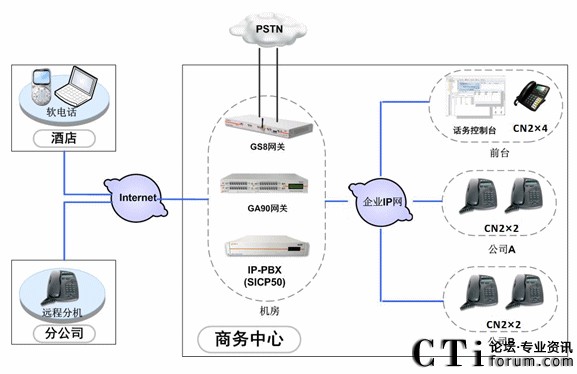 中天凱旋利用企業(yè)內(nèi)部完善的IP通信網(wǎng)絡(luò),在機房部署SICP系統(tǒng),負責整個語音通信系統(tǒng)的服務(wù)管理、用戶管理。部署GA90網(wǎng)關(guān)和GS8網(wǎng)關(guān),分別使用E1中繼線路和普通模擬線路接入PSTN網(wǎng)絡(luò),保證系統(tǒng)的通信。