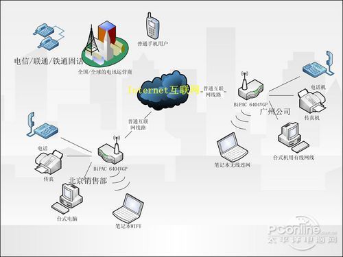 BiPAC 6404VGP其實就是一個VoIP語音網(wǎng)關(guān),VoIP就是一種把語音信號轉(zhuǎn)換成在網(wǎng)絡(luò)上傳輸?shù)臄?shù)字信號的技術(shù),它的應(yīng)用已經(jīng)非常成熟,我們經(jīng)常使用的QQ語音聊天功能也就是VoIP的一種表現(xiàn)形式。在所有大型跨國企業(yè)里我們幾乎都能看到VoIP技術(shù)的身影,這是因為電信運營商的長途電話費一般都不便宜,而我們企業(yè)的網(wǎng)絡(luò)使用費一般又是包月的,通過無限包月的網(wǎng)絡(luò)打免費的國際國內(nèi)長途電話不就是占電信的便宜嘛?