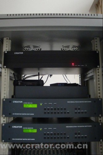 A/V系統(tǒng)由AV矩陣、RGB矩陣、計(jì)算機(jī)、攝像機(jī)、DVD、調(diào)音臺、話筒、音箱等A/V設(shè)備構(gòu)成。它完成對各種圖文信息的播放功能,實(shí)現(xiàn)現(xiàn)場音頻系統(tǒng)配合投影幕投影系統(tǒng)提供優(yōu)質(zhì)的視聽效果。并且還可以通過數(shù)字錄像機(jī),能夠?qū)⒄麄過程記錄在錄像機(jī)中,便于以后的查詢、回顧等。該檢察院通過AV0808和VGA0808這兩個矩陣對兩個會議廳的視頻輸入輸出設(shè)備進(jìn)行信號的任意選擇與切換,既可以選擇一對一輸出視頻信號,又可以一對多進(jìn)行視頻信號的切換。
