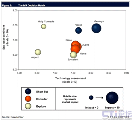 Datamonitor的分析數(shù)據(jù)顯示, 在參與評(píng)估的9家IVR應(yīng)用和服務(wù)提供商中,Genesys和Voxeo公司在技術(shù)實(shí)力、最終客戶滿意度和市場影響力三項(xiàng)的綜合評(píng)分處于領(lǐng)先,從而被Datamonitor推薦為最佳IVR應(yīng)用和服務(wù)提供商(如下圖所示)。