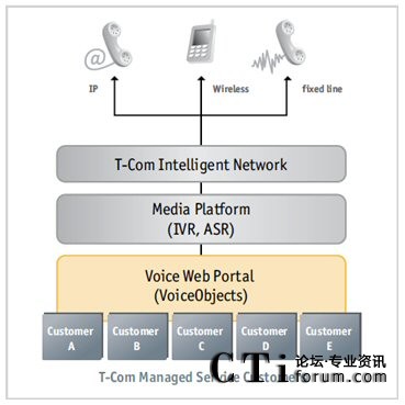 T-Com轉(zhuǎn)向VoiceObjects尋求一個可以管理成百上千應(yīng)用的解決方案,確保對客戶的高可用性和可靠性,并且?guī)椭3脂F(xiàn)有和未來的開發(fā)和更改成本在一個低水平上。在2004年初,T-Com引入了語音Web門戶,一個發(fā)揮了Web基礎(chǔ)架構(gòu)和立足于VoiceObjects服務(wù)器網(wǎng)絡(luò)版本的語音應(yīng)用服務(wù)平臺!拔覀冋趯ふ也粌H能幫助我們開發(fā),而且可以維護和管理我們的自服式電話應(yīng)用的解決方案,”Klindworth說:“當(dāng)時真的還沒有電話應(yīng)用服務(wù)器公司目錄,但這正是我們需要的:該產(chǎn)品是服務(wù)執(zhí)行平臺,并且以Web應(yīng)用服務(wù)器的方式工作。我們發(fā)現(xiàn)它就是VoiceObjects!