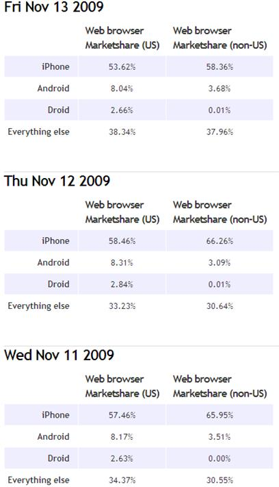 Droid的主要競爭對手是蘋果的新款iPhone。在6月份開售的首個周末,蘋果售出了超過100萬部新款iPhone。而摩托羅拉上一季度在全球手機(jī)市場的份額從第二季度的5.5%下降至4.7%。來看一下近三日Droid和iPhone的美國網(wǎng)絡(luò)瀏覽市場份額對比: