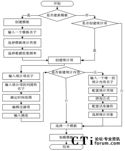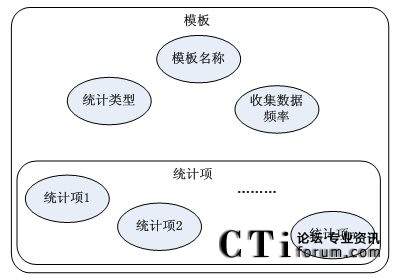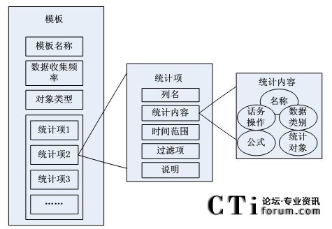 由模板結(jié)構(gòu)框架圖得知,模板包括模板名稱,數(shù)據(jù)統(tǒng)計(jì)對象,收集數(shù)據(jù)的頻率和多個基本統(tǒng)計(jì)項(xiàng)。其中,每個統(tǒng)計(jì)項(xiàng)對應(yīng)著統(tǒng)計(jì)對象(如:坐席,路由點(diǎn)等)的一條統(tǒng)計(jì)內(nèi)容信息(如:1小時內(nèi)的呼叫總量等)。然后由這些統(tǒng)計(jì)項(xiàng)和統(tǒng)計(jì)參數(shù)組合成模板,從而構(gòu)成對呼叫中心對象的統(tǒng)計(jì)信息。