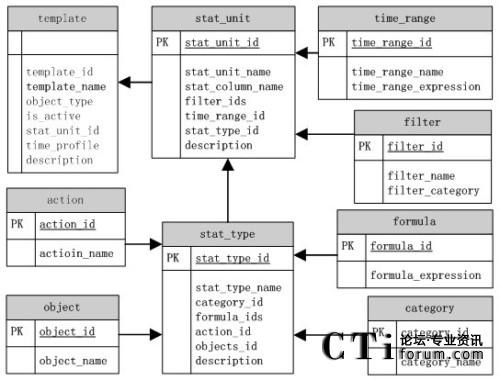在模板配置存儲模型圖中,分別建立了單獨(dú)的表對模板劃分的每一個基本對象進(jìn)行儲存。表template存儲模板的配置信息,stat_unit表存儲了統(tǒng)計(jì)項(xiàng)的基本信息,stat_type表是一些有關(guān)模板具體內(nèi)容的配置。各表之間通過各自的ID標(biāo)識號來進(jìn)行關(guān)聯(lián)。不過一個模板可以包括多個統(tǒng)計(jì)單元,一個統(tǒng)計(jì)項(xiàng)可以包含多個過濾項(xiàng),一個統(tǒng)計(jì)內(nèi)容可以包含多個公式,這樣他們之間的ID關(guān)聯(lián)就成為1對多的關(guān)系。在這種情況下,父項(xiàng)中的ID關(guān)聯(lián)多個子項(xiàng)ID,其間是用逗號分隔。