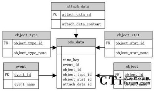 根據(jù)ODS源數(shù)據(jù)庫模型圖,ods_data表中存儲了事件發(fā)送的時間(time_key)、事件(event)、報(bào)表統(tǒng)計(jì)對象(object)、對象狀態(tài)(object_stat)、對象類型(object_type)以及一些隨路數(shù)據(jù)(attach_data)等信息。這些對象的詳細(xì)信息都是以各部分的ID來對內(nèi)容進(jìn)行關(guān)聯(lián)。