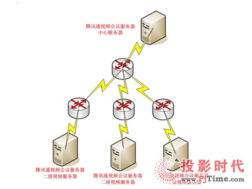 整套視頻系統(tǒng)基于原有IP數(shù)據(jù)網(wǎng)絡(luò),在中心機房建立視騰訊通視頻系統(tǒng)中心服務(wù)器,負責二級服務(wù)器的連接及控制,用戶數(shù)據(jù)和會議數(shù)據(jù)采用虛擬服務(wù)器管理技術(shù),即在不同的虛擬服務(wù)器的用戶和會議數(shù)據(jù)不能相互看到,當需要召集不同虛擬服務(wù)器用戶的會議時通過管理員進入后臺召集跨虛擬服務(wù)器的會議,以實現(xiàn)各個單位之間的大會議的需求。這樣既能快速召開部門內(nèi)小型視頻會議,同時又能分別在各省市支部召開區(qū)域型的大型會議。
