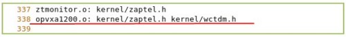 再找到 ztmonitor.o: kernel/zaptel.h 這一行,添加一行代碼,保存退出,如下: