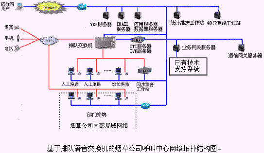該煙草公司呼叫中心主要是由語音交換機、CTI服務器、IVR(交互式語音應答)/IFR(交互式傳真應答)子系統(tǒng)、人工座席子系統(tǒng)、應用服務器、數(shù)據庫服務器、業(yè)務網關子系統(tǒng)、通信網關子系統(tǒng)等硬件設備和應用軟件組成。
