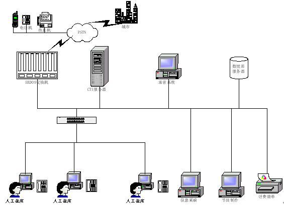 1) 數(shù)據(jù)庫系統(tǒng): 存放各類待查信息數(shù)據(jù)、話務(wù)統(tǒng)計數(shù)據(jù)、話務(wù)員操作明細(xì)數(shù)據(jù)等;
